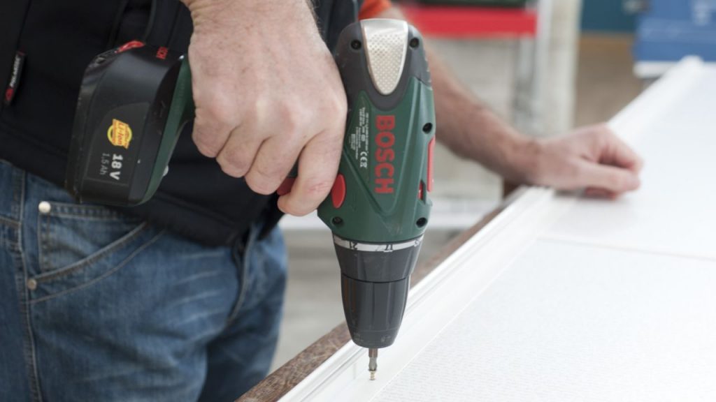 A continuación, colocamos los perfiles tiradores y los fijamos con los tirafondos que incluye el propio kit. Para introducirlos, utilizaremos el taladro atornillador provisto de una punta adecuada al tamaño y la forma de la cabeza del tornillo.